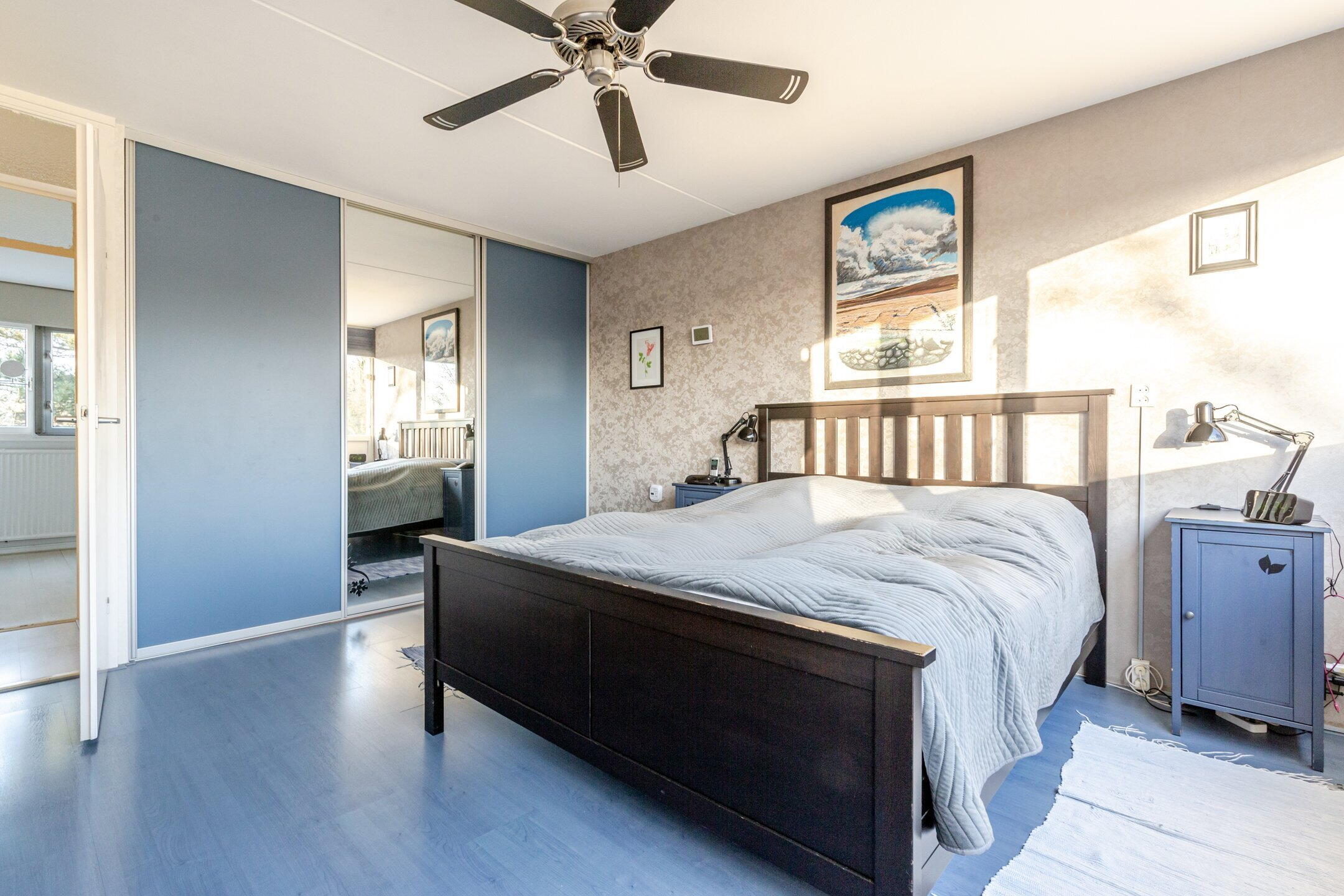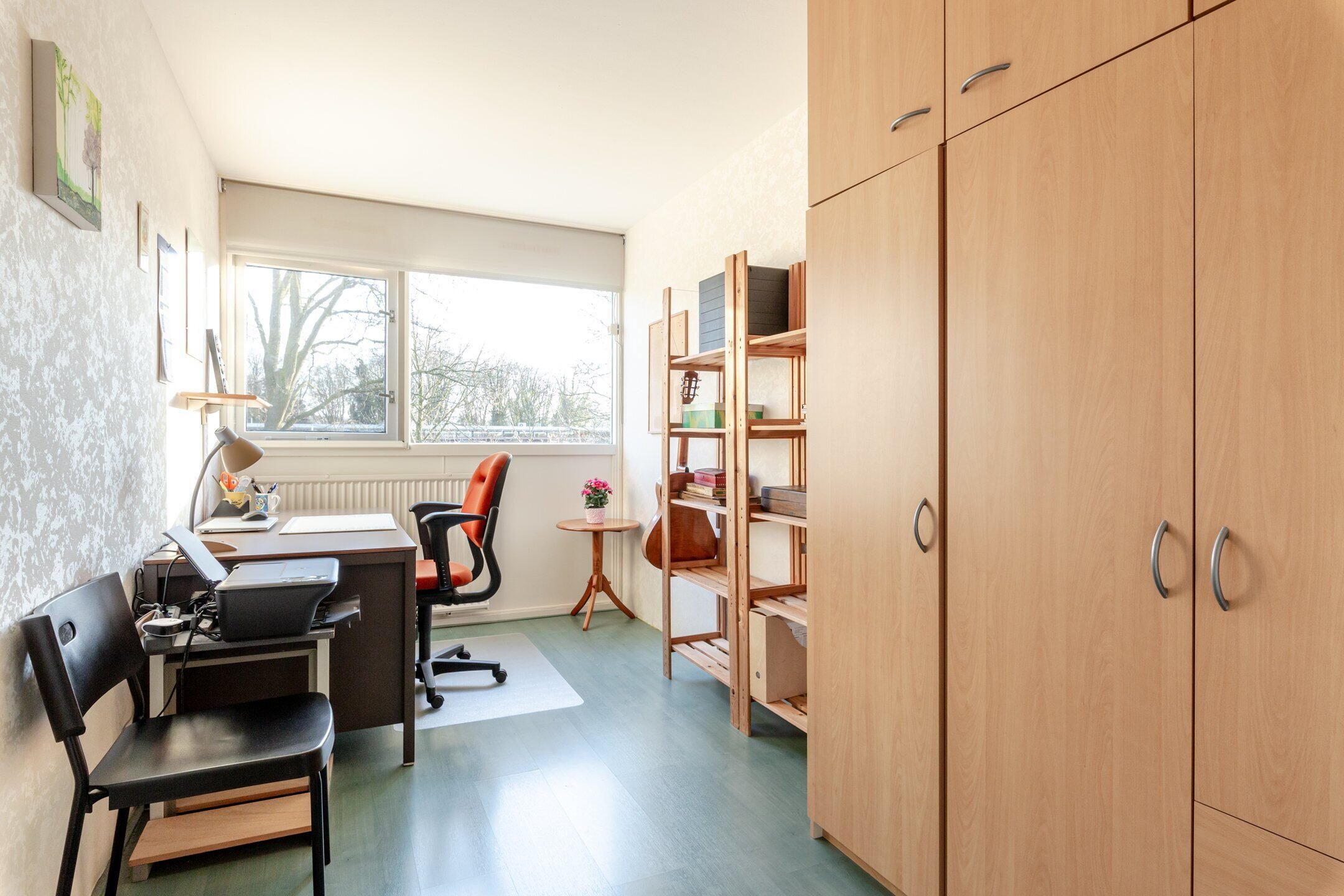 De verdieping is grotendeels voorzien van een houten vloerbekleding.
