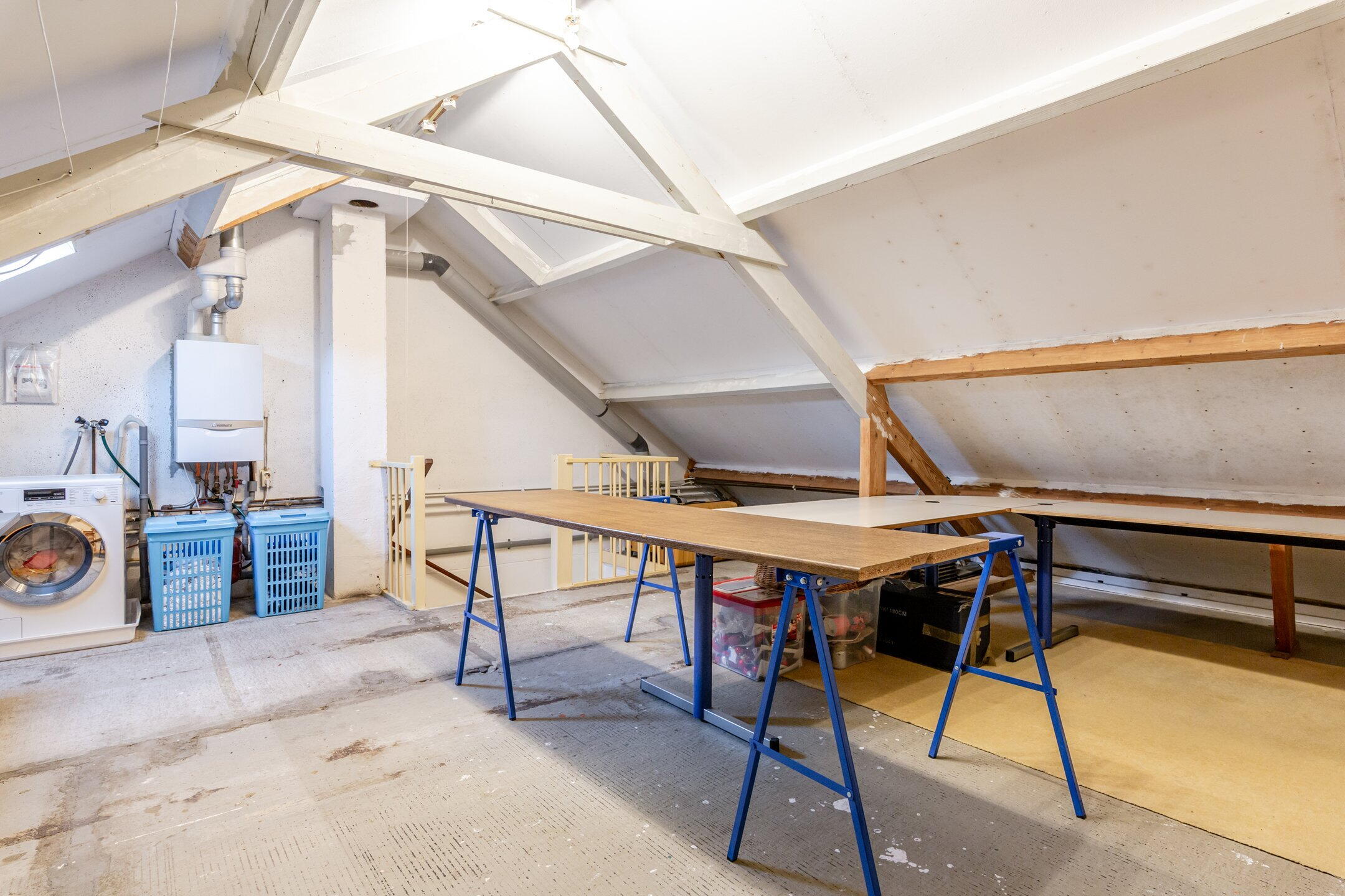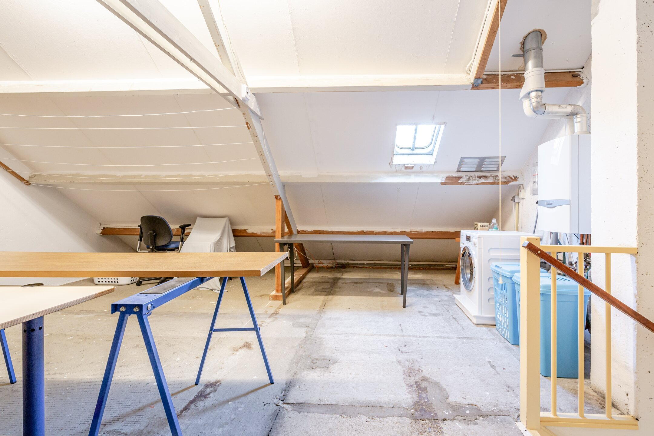 Derde verdieping: forse open zolder met de wasmachine aansluiting, de opstelling voor de cv-ketel (Vaillant Eco Tec plus , bouwjaar 2013, eigendom) en een klein dakraam; Na het plaatsen van een dakkapel of twee dakramen zijn er vrij eenvoudig één of twee slaapkamers te realiseren.