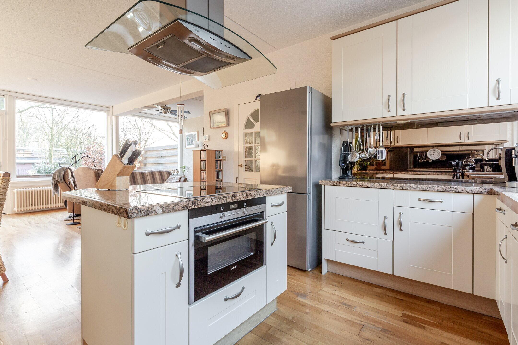 Eerste verdieping: Overloop; vaste kast, vrijhangend toilet met fonteintje en toegang tot de woonkamer; tuingerichte woonkamer van ruim 40m²!! met toegang tot het balkon/terras van circa 15m² met een trap naar de achtertuin; keuken in U-opstelling aan de voorzijde van de woning welke is voorzien van een klein kookeiland de navolgende inbouwapparatuur: keramische kookplaat, RVS/glas afzuigschouw, combi magnetron/oven en een volledig geïntegreerde vaatwasser.